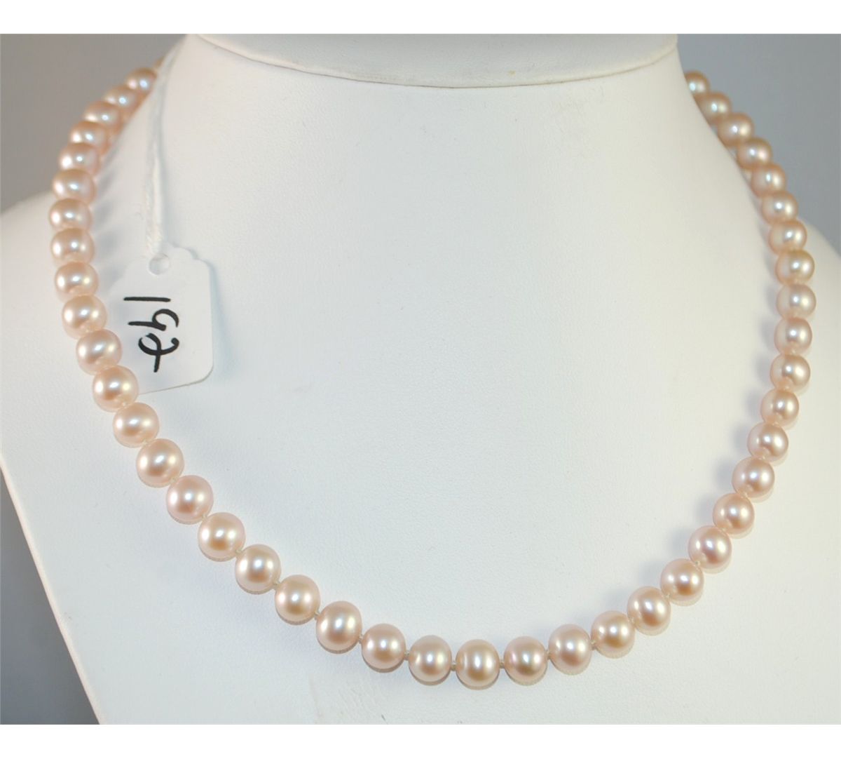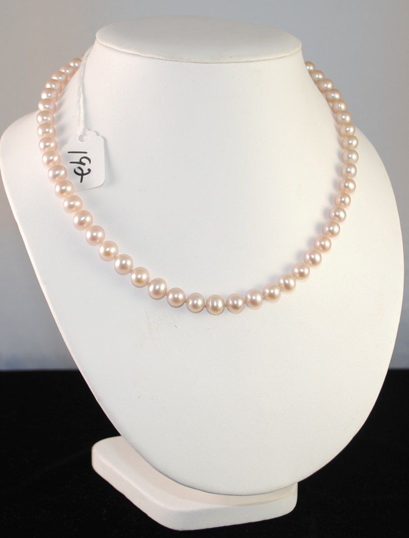 ELEGANT LADIES PEARL NECKLACE WITH FIFTY SIX ROUND MATCHING 7 1/2 MM PEARLS - HAND KNOTTED WITH 14K YELLOW GOLD CLASP