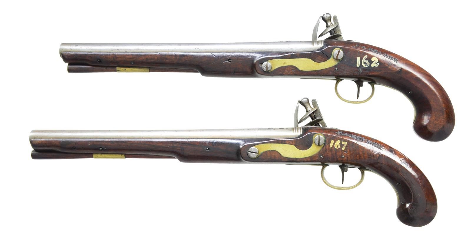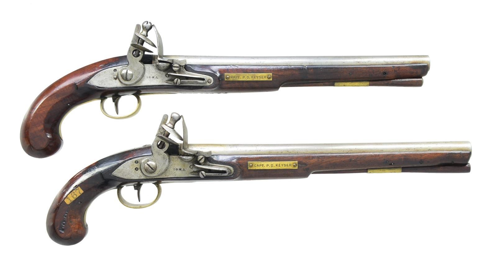 ANCESTOR OF CIVIL WAR CAPTAIN AND FOUNDER OF MOLLUS, PETER DIRCK KEYSER. Cal. 55 (28 bore). NSN. Bbls. 12" rnd. w/ London proofs near breech. This pair have a refined simplistic elegance, chaste in design w/ no engraving, quite American in style of early 19th Century Kentucky pistols. Locks have flat supported cocks & unbridled frizzens, single brass ramrod pipe & brass trigger guard. Locks are marked “I. Rea” for John Rea dating circa 1800. Each pistol is branded twice “P. A. KEYSER” who was probably Peter Augustus Keyser (1805-1869) father of Capt. P.D. Keyser whose name appears on sm. brass plaques along w/ old exhibition numbers 162 & 167 painted on each. This pair have been well cared for showing little use & 2 generations having their names attached. Peter Dirck Keyser was Capt. in the 91st Pennsylvania & one of the 3 founding members of the Military Order of the Loyal Legion United States, his membership number is 3. UNATTACHED ACCESSORIES: large file of research into Keyser family. CONDITION: fine overall, both are original & complete, well fit, iron is gray & mostly smooth overall, brass has light mustard patina. Stocks are sound & solid, one gun has chip under forward section of lock & hairline crack between sideplate & bbl., plus a hairline following grain about midpoint on right side bbl. channel. Guns were cleaned & varnished back when fashionable, late 19th & early 20th century. Even the attached plaques & inventory numbers are varnished or shellacked over. Guns are mechanically crisp w/ smooth pitted bores. PROVENANCE: From the Collection of John "Tim" Breth Jr. (01-17762/JS). ANTIQUE. $5,000-7,000.