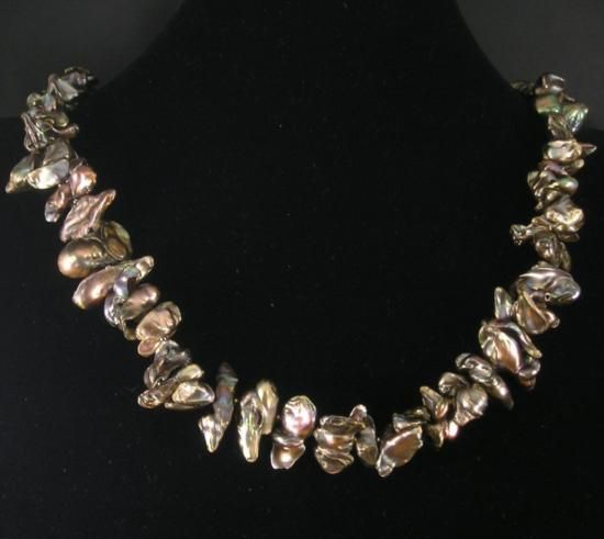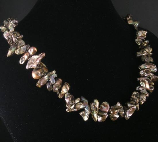 ELEGANT PEACOCK BLACK PETAL BAROQUE PEARL NECKLACE, Such beautiful colors in these deep Peacock Tahitian Black color freshwater baroque petal pearls. Amazing textures, color and sheen! 21 inches long, adjustable to 24inches with sterling silver clasp and extender chain.