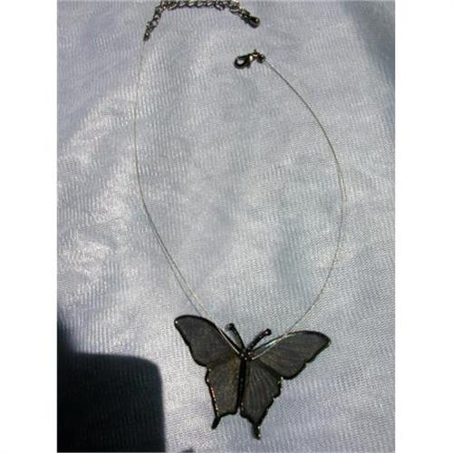 THIS OLD HANDCRAFTED BUTTERFULY SILVER PENDANT IS 2.00" WIDE, 1.25" HEIGHT. THE WINGS ARE A MESH OF INTRICATE SILVER COLOURED IN BLACK. THE NECKLACE IS A SILVER WIRE COVEREDD IN BLACK LACQUER? ENDING IN A SHORT (CUFF-LINK LIKE)_ CHAIN ON EITHER SIDE WITH AN INTERESTING CLASP THAT MIGHT HELP TO DATE IT.