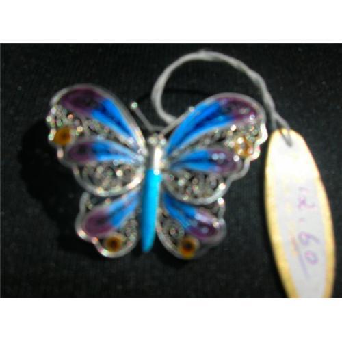 THIS OLD STERLING SILVER BROOCH/PIN IS IN THE FORM OF A BUTTERFLY. THE BODY IS SOLID SILVER WITH BLUE ENAMEL WHILE THE WINGS ARE ENAMEL ON SILVER LACEWORK, ALTERNATING WITH SEGMENTS OF DELICATE PLAIN LACEWORK PATTERN, WITH SOLID STERLING ANTENNAE. THE WORKMANSHIP IS IMPRESSIVE. THE BACK IS ENGRAVED WITH "S.925" AND ORIGINAL LABEL "MADE IN CHINA" AND