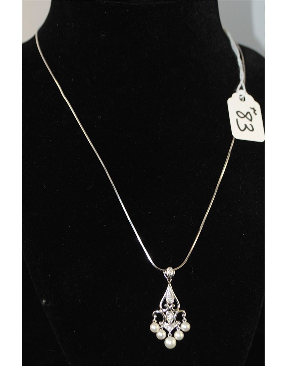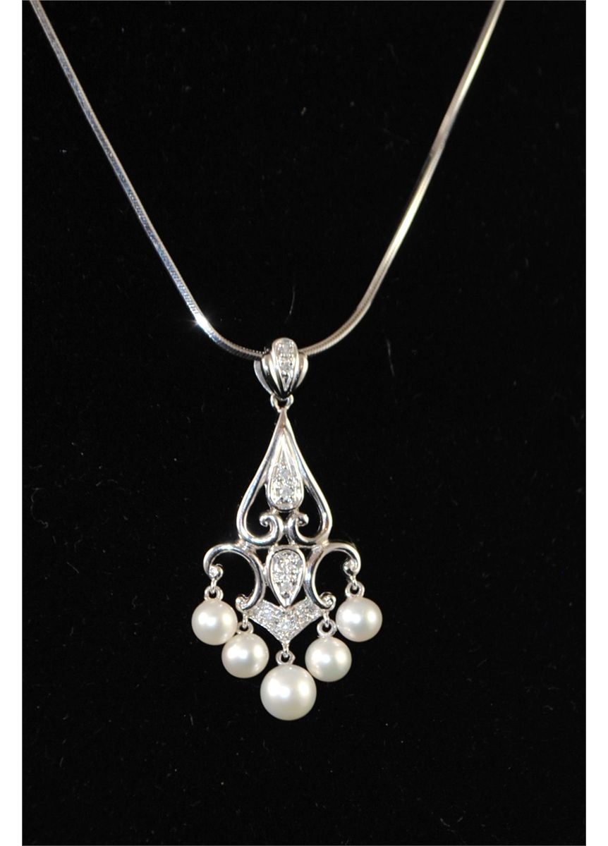 ELEGANT WOMENS PEARL & DIAMOND PENDANT WITH FIVE GRADUATED DANGLE PEARLS AND SEVEN ROUND DIAMONDS SET IN FANCY 14K WHITE GOLD PENDANT WITH 14K WHITE GOLD SNAKE STYLE CHAIN - APPRAISED RETAIL REPLACEMENT IS $3,550.00 - COMES WITH THE APPRAISAL CARD FOR INSURANCE PURPOSES