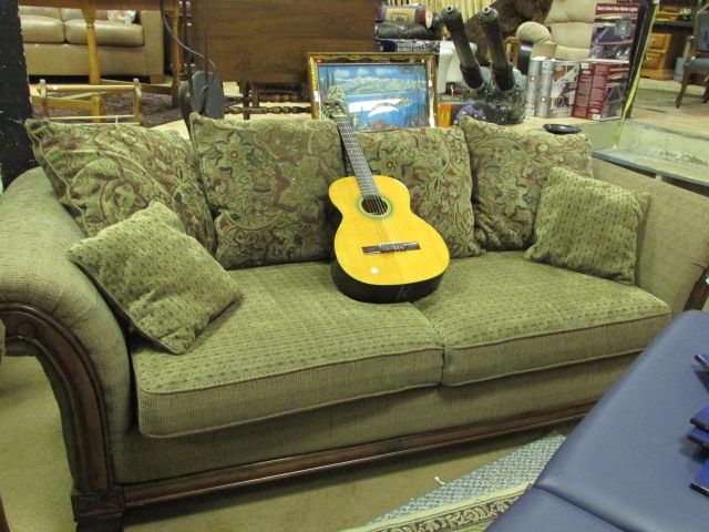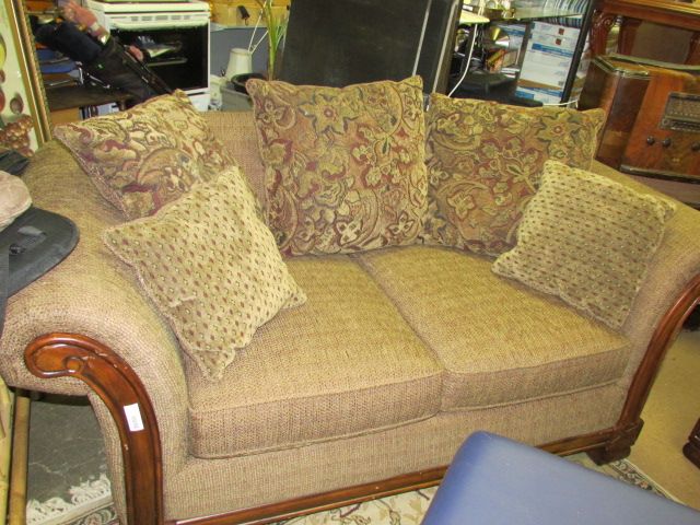 ELEGANT WOOD ACCENT UPHOLSTERED LOVESEAT WITH MANY ACCENT CUSHIONS