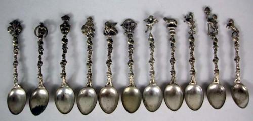 ELEVEN 800 SILVER FIGURAL HANDLED DEMI-TASSE SPOONS; Total weight, apx. 2 T.O.