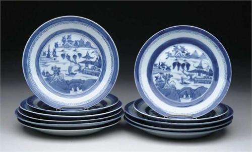 ELEVEN BLUE AND WHITE CANTON PLATES. Lot consists of seven 10” plates - One with hairline and two with chips. Four 8-1/2” plates - Very minor roughness. 9-27653