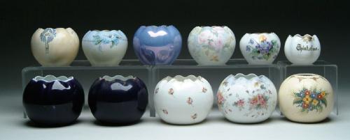ELEVEN CHINA and POTTERY ROSE BOWLS. Lot consists of five china rose bowls with floral decorations, one china rose bowl with a portrait, one china rose bowl with an Oriental pattern, a pottery rose bowl with floral decoration and three blue china rose bowls. Three of the rose bowls are pictured in the "Collectible Glass Rose Bowls" by Johanna Billings fig. 313 pg. 98, fig. 457 pg. 141 and fig. 312 pg. 97. SIZE: Range from 3-1/4 in. to 4-1/2 in. dia. CONDITION: Very good to excellent. Collection of Johanna and Sean Billings 5-60875