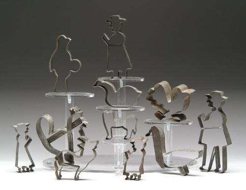 ELEVEN FIGURAL TIN COOKIE CUTTERS. All with no back. Containing four family members, birds, deer and more. SIZES: 3in. to 6in.. CONDITION: Two seams unsoldered, generally good. 9-25423-9