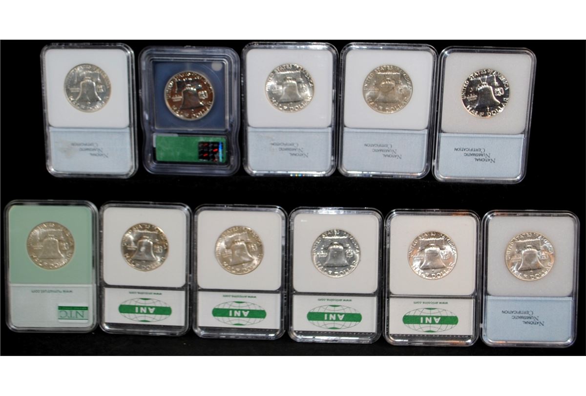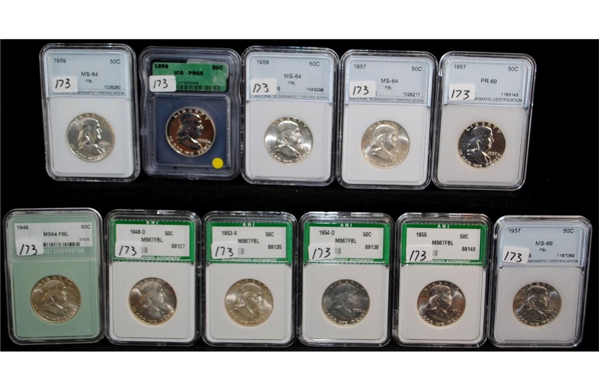 11 GRADED FRANKLIN HALF DOLLARS - INCLUDES 1948-D ANI MS67FBL, 1948 NTC MS64FBL, 1953-S ANI MS67FBL, 1954-D ANI MS67FBL, 1955 ANI MS67FBL, 1957 NNC MS64 FBL, 1957 NNC MS66 FBL, 1957 NNC PR69, 1958 ICG PR65, 1958 NNC