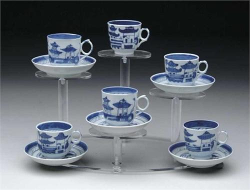 ELEVEN PIECES OF BLUE AND WHITE CANTON. Six 2-1/4” h demitasse cups and five 4” saucers. CONDITION: Generally very good. 9-27633; 27649