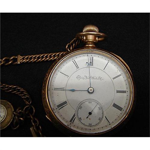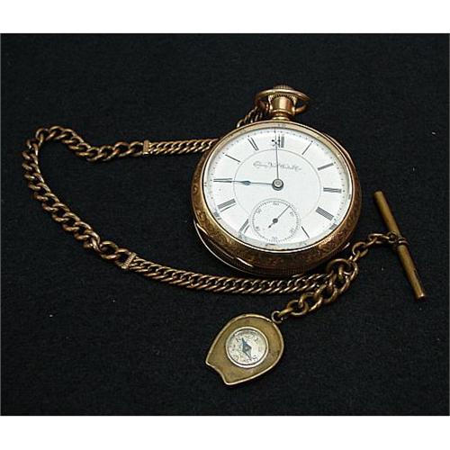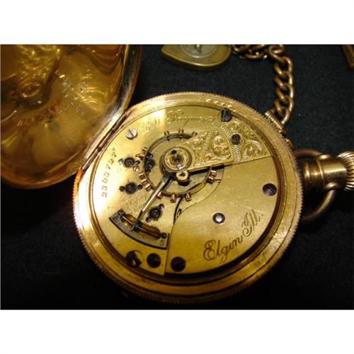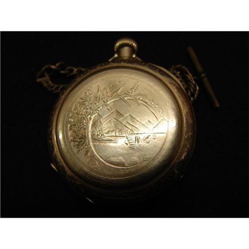 ELGIN POCKETWATCH. Has etched river scene with mountains and boats on back of case. Case #249415. Watch works are marked “2303727” and “B.W. Raymond/Elgin”. Has compass fob and leather case.