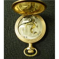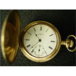 Elgin pocket watch circa 1876. Triple-hinged Hunting Case. Sidewinder. No crystal. SN 4985251. Beautiful Art Nouveau design on case. Made by Philadelphia Watch Case Co. Condition: Not working.
