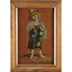 ELGIN WATCH ADVERTISEMENT. This well-known ad depicts a small street urchin sporting an Elgin watch, titled “My Elgin’s All Right”. The lithograph image is on an oak panel. It is framed in what may be the original frame. Advertisement retains original instructions on the reverse of the sign. SIZE: Including the frame is 18 1/4” w. x 25” h. 1-4667 (750-1,250)