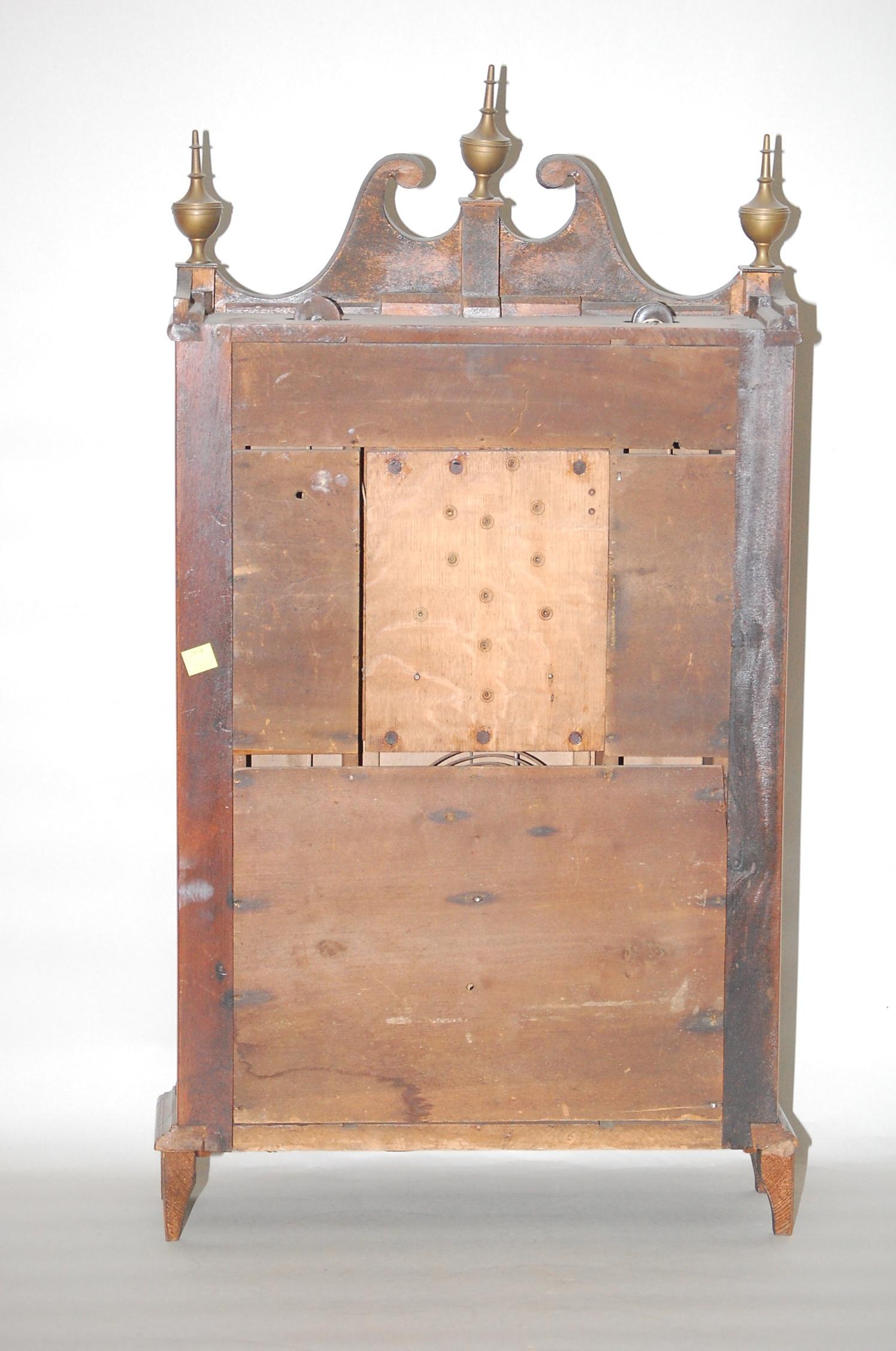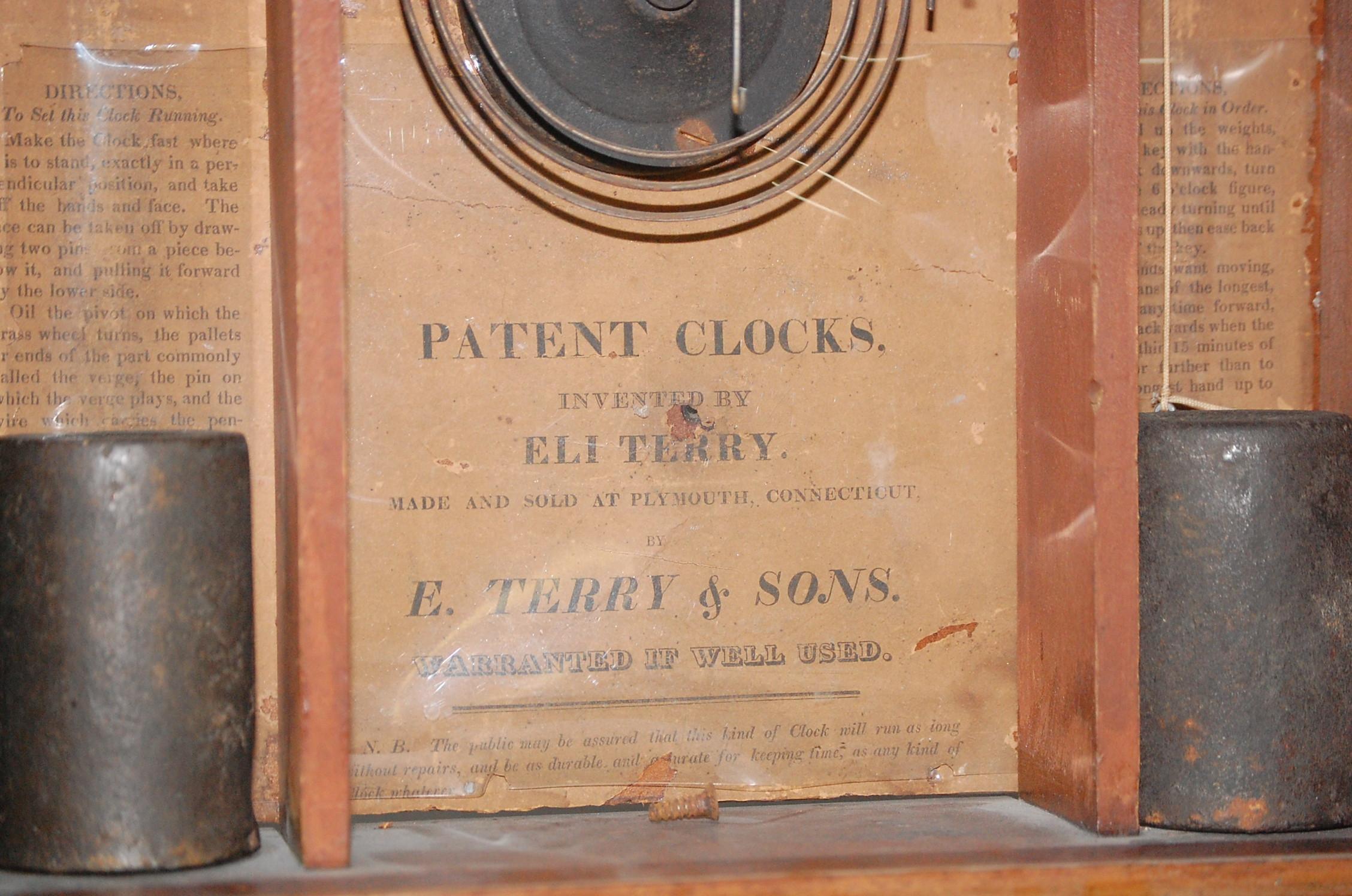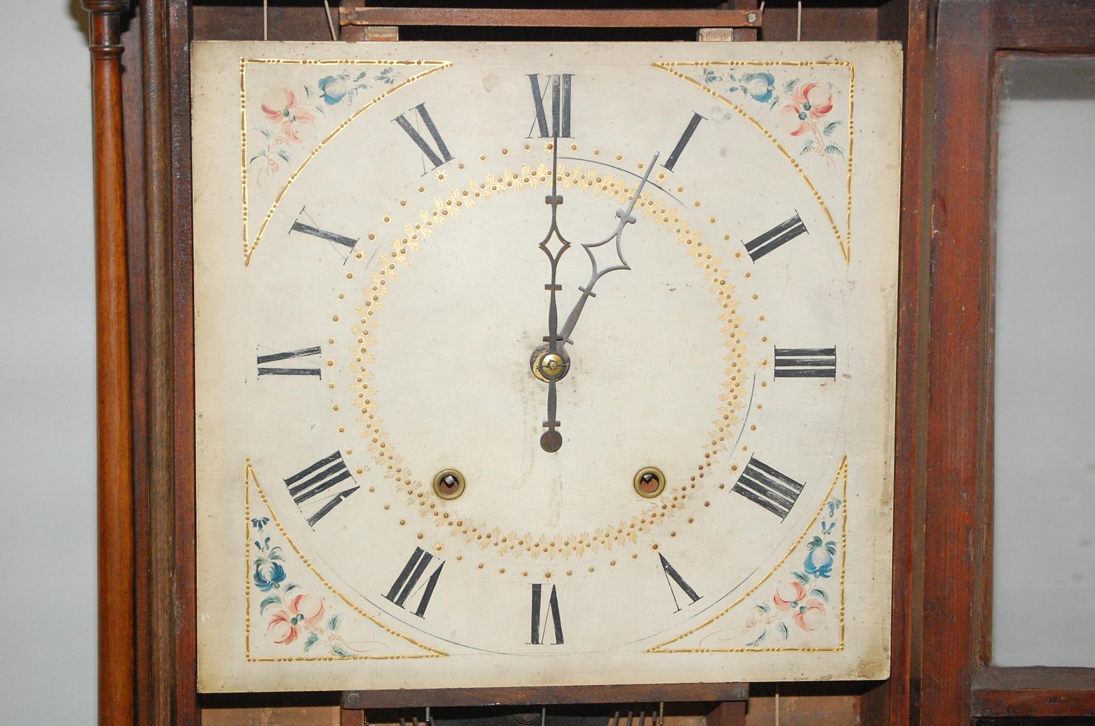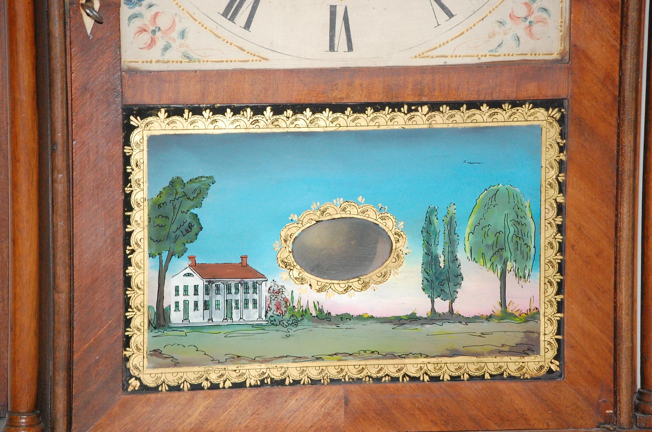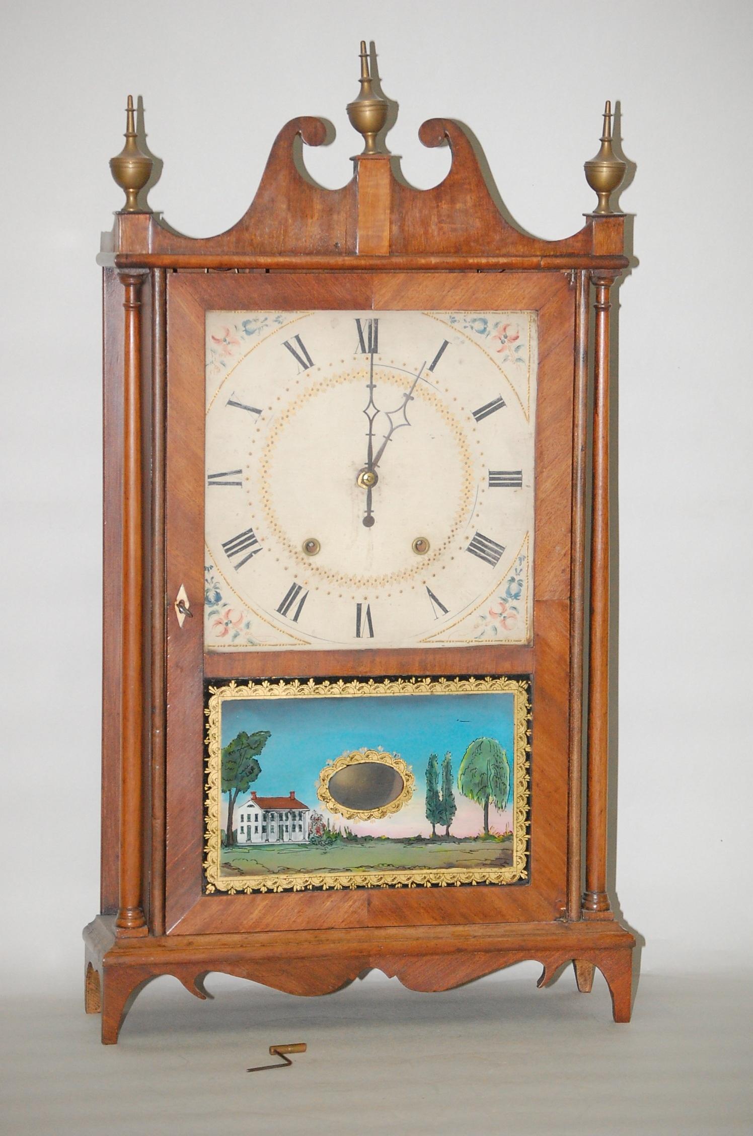 ELI TERRY PILLAR & SCROLL SHELF CLOCK - PLYMOUTH CT W/MAHOG. CASE, SCROLL CARVED BASE, TURNED POSTS, BROKEN ARCH CREST, BRASS FINIALS, PAINTED WOOD FACE & REVERSE PTG. ON GLASS LANDSCAPE PANEL (32"T X 17.25"W)-WEAR, REPAIRS, REPLACEMENTS, IMPERFECTIONS