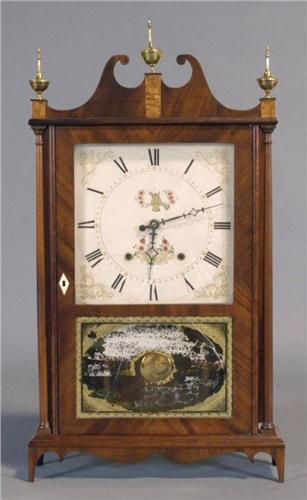 ELI TERRY SHELF CLOCK, Connecticut, circa 1825, CONDITION: finials replaced, both glasses with cracks, bottom glass surface worn.