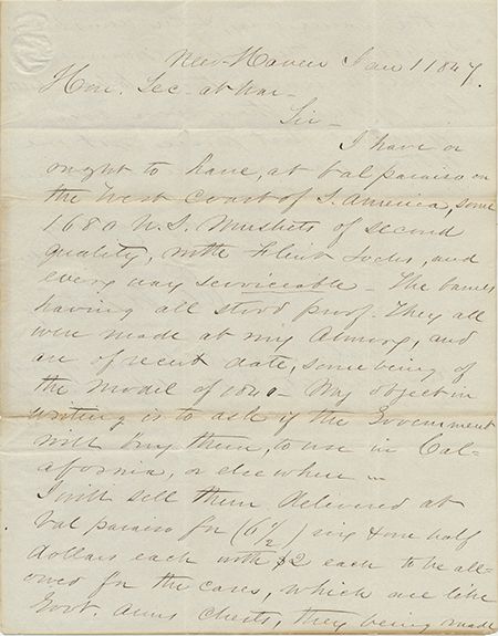 (1820-?) The only son of inventor of the cotton gin, Eli Whitney, which revolutionized the trade, he assumed control of his father's armory in New Haven, producing percussion-cap rifles and later the Whitneyville Colt Revolver with Samuel Colt. Good content A.L.S. 2pp. 4to., New Haven, Jan. 1, 1847, to Hon. Sec. Ahran [?], in part: "...I have...some 1680 U.S. Muskets of second quality, with Fluid Jacks, and every way serviceable...They all were made at my Armory, and are of recent date, some being of the model of 1840 - My object in writing is to ask if the Government will buy them, to use in California, or elsewhere ....". Toned foles with a hole or two thereon, otherwise very good.