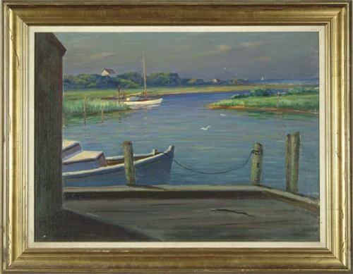 ELIOT CANDEE CLARK (American, 1883-1980) GWYNN'S ISLAND, VIRGINIA. Oil on board scene shows a low island with river inlet having a moored sailboat and a power boat alongside dock. A house is seen on bluff overlooking blue ocean with sailboat. Signed lower right "Eliot Clark". Written on back in black "Gwinn's Isle VA 54". Housed in a good gilt frame with white liner. SIZE: 20" x 27". CONDITION: Very good. 9-26431