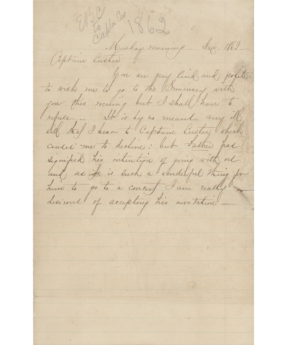(1842 - 1933) American author, wife of George Armstrong Custer, Union brigadier general killed at the Battle of Little Big Horn. Rare early A.L. (unsigned), 1p. 8vo., Monroe, December, 1862 to her future husband, George A. Custer. In part: "...Captain Custer You are kind and polite to wish me to go to the Seminary with you this evening but I shall have to refuse. It is by no means any ill will that I bear to Captain Custer causes me to decline: but Father has signified his intention of going with us...I am really desirous of accepting his invitation...". Marginal tear, wrinkled and soiled a bit, pencil note at head, else still quite good. Home on leave from the war, Custer met Libbie at a Thanksgiving party and began courting her against the wishes of her family. Indeed, even Libbie remarked to a friend: "I don't care for him except as an escort".