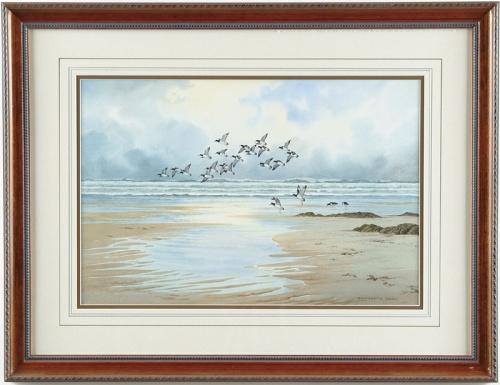 ELIZABETH GRAY (Irish, 1879-1976) OYSTER CATCHERS. Watercolor scene shows twenty-one flying birds coming in to land on sandy beach with tidal pool. Two are seen standing in water with light surf in background. Housed in a good carved wood frame with double matte having watercolor line highlights. SIGHT SIZE: 13-1/2in. x 20in.. CONDITION: Very good. 9-25981