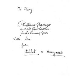 (b. 1926) Reigning Queen of England. Charming D.S. 11" x 7", a Christmas card bearing a portrait of a young girl on the cover, signed beneath the interior printed message: "To Mary...with love from Lilibet", and additionally by her sister, PRICESS MARGARET who adds "& Margaret". Fine condition.