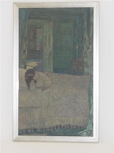 ELIZABETH SHIPPEN GREEN ORIG. W/C-GOUACHE OF YOUNG GIRL LYING IN BED IN INTRICATE DECORATED & DETAILED ROOM W/ MOONLIGHT SHINING (GREAT ATTENTION TO DETAIL), SIGNED IN BANNER L.L. ELIZABETH SHIPPEN GREEN IN ORIG. FRAME (23 1/2" X 14") - VERY GOOD