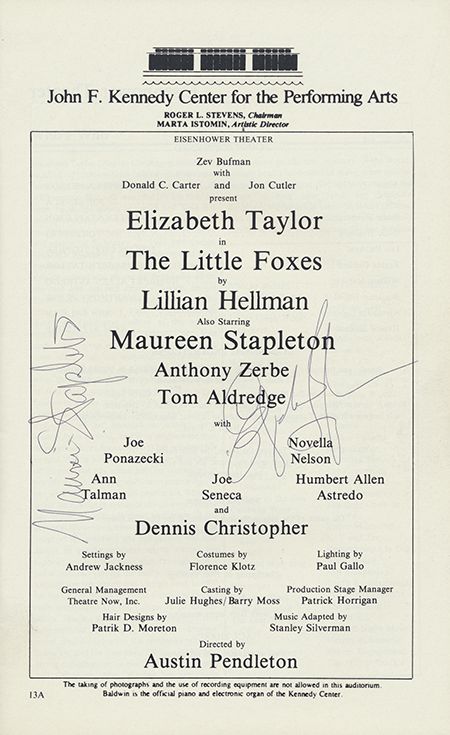 (1932 - 2011) American actress, a glamorous leading lady and winner of two Academy Awards for Best Actress. Playbill from the J.F.K. Center, Washington, 1980, printed for a performance of The Little Foxes which starred Taylor, signed by her on the page listing cast members, also signed by co-star MAUREEN STAPLETON. Fine. Sold with: RAY BOLGER, printed 8" x 5" color photo of Bolger "in flight", nicely signed, and DOUGLAS FAIRBANKS, 1930 signature on an album page, some offsetting. Three pcs.