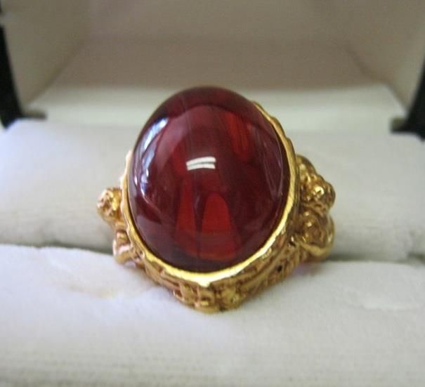 ELIZABETH TAYLOR DESIGNER CHERUB RING SIZE 7. The stone is a 32 Ct. Golden Red Polished Agate. The metal is 18 ct Gold Guilt over Silver.