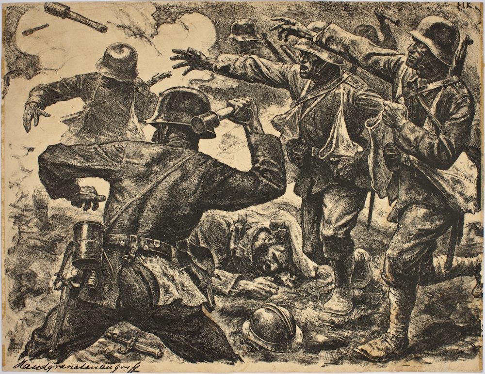 (1892 - 1941) German artist, born Wilhelm Emil Eber. Eber was one of the most famous of German military artists, largely remembered for his distinctive battle scenes and forceful portraits of soldiers and officers in uniform. An early member of the S.A., Eber sketched party events and street battles, while at the same time indulging his passion for painting American Indians and western scenes. Hitler himself was enamored of Eber's work, purchasing several pieces for his collection. Signed print, his "Hand Grenade Battle", 23 1/2" x 18" heavy stock, lightly-signed "Elk Eber" in pencil at lower right. The image shows a group of German soldiers throwing grenades at an unseen enemy at left, though clearly French as one lies wounded at their feet. Some flaws: signature, as mentioned, is light but legible, and is affected somewhat by a stain and toning, some glue remnants at left and right margins, and possibly trimmed, and a few trivial stains. Nevertheless, still very appealing and a very rare image when signed by the artist.