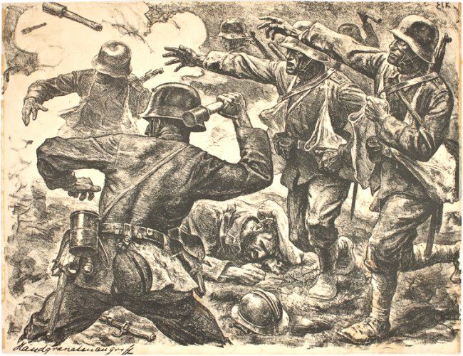 (1892 - 1941) German artist, born Wilhelm Emil Eber. Eber was one of the most famous of German military artists, largely remembered for his distinctive battle scenes and forceful portraits of soldiers and officers in uniform. An early member of the S.A., Eber sketched party events and street battles, while at the same time indulging his passion for painting American Indians and western scenes. Hitler himself was enamored of Eber's work, purchasing several pieces for his collection. Signed print, his "Hand Grenade Battle", 23 1/2" x 18" heavy stock, lightly-signed "Elk Eber" in pencil at lower right. The image shows a group of German soldiers throwing grenades at an unseen enemy at left, though clearly French as one lies wounded at their feet. Some flaws: signature, as mentioned, is light but legible, and is affected somewhat by a stain and toning, some glue remnants at left and right margins, and possibly trimmed, and a few trivial stains. Nevertheless, still very appealing and a very rare image when signed by the artist.