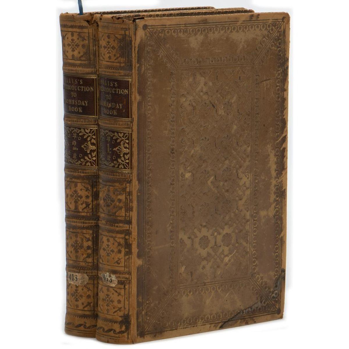 A General Introduction to the Domesday Book; Accompanied by Indexes of the Tenants in Chief, and Under Tentants... In Two Volumes. Printed by Command of His Majesty King William IV. Under the Direction of The Commissioners on the Public Records of the Kingdom. London: George Eyre and Andrew Spoitiswoode, 1833. 8vo. Red gilt labels, blindstamped leather, marbled endpapers, all edges marbled. Paper number labels on spines. Fair. Vol. I is dampstained; the stain shows on the corner of the cover, and extends to the front and back endpapers and pages, and to several pages scattered throughout. Vol. II inner hinge split at a few pages from the front. Both have overall edgewear and rubbing, losses/tears to top of spines.