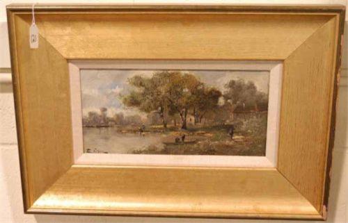 7"x14" oil on canvas <BR> Pond Scene with Boaters <BR> signed <BR> Condition: excellent <BR> Continental U.S. shipping not including insurance, $30 <BR>