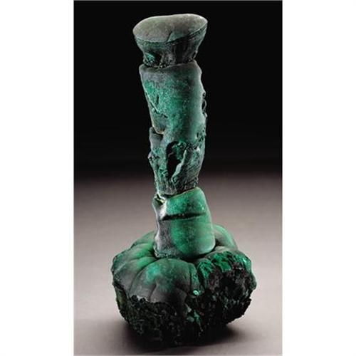 <B>ELONGATED MALACHITE STALACTITE</B></I><BR> <I>Star of the Congo Mine, near Lubumbashi, Katanga Copper Zone, Katanga (Shaba), People's Democratic Republic of Congo (Zaïre)</B></I><BR>This specimen is an exceptionally long malachite stalactite, rising from a malachite base as if reaching for the sky. In fact, during its formation it was actually attached to the ceiling of a cave. As time passed, it grew longer and longer as copper carbonate slowly precipitated out of solution, dripped down its slender form and ever so minutely lengthened it. Given the length of this specimen, its growth took a tremendous amount of time. It is very unusual to obtain undamaged stalactites on matrix in good condition because extreme care must be taken by the miners to extract it - a time consuming process at best. And additionally the specimen must survive shipping and cleaning before it is ready for exhibition. This specimen is in fine condition and the overall length is 8 inches and the base is roughly 4 x 4 inches.<BR><BR><b>Shipping:</b> Requires 3rd Party Shipping (<a target="_blank" href="http://www.heritageauctions.com/common/shipping.php">view shipping information</a>)