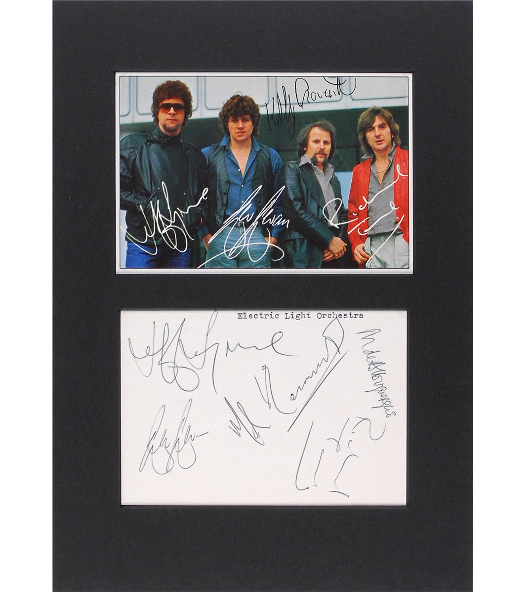 Uncommon vintage ballpoint signatures of Jeff Lynne, Mike de Albuquerque, Mik Kaminski, Richard Tandy, and Bev Bevan on an off-white 5.5 x 3.75 card. Matted with a photo bearing pre-printed signatures to an overall size of 8.25 x 11.75. In fine condition. This grouping of signatures represents Electric Light Orchestra’s 1973–74 lineup.
