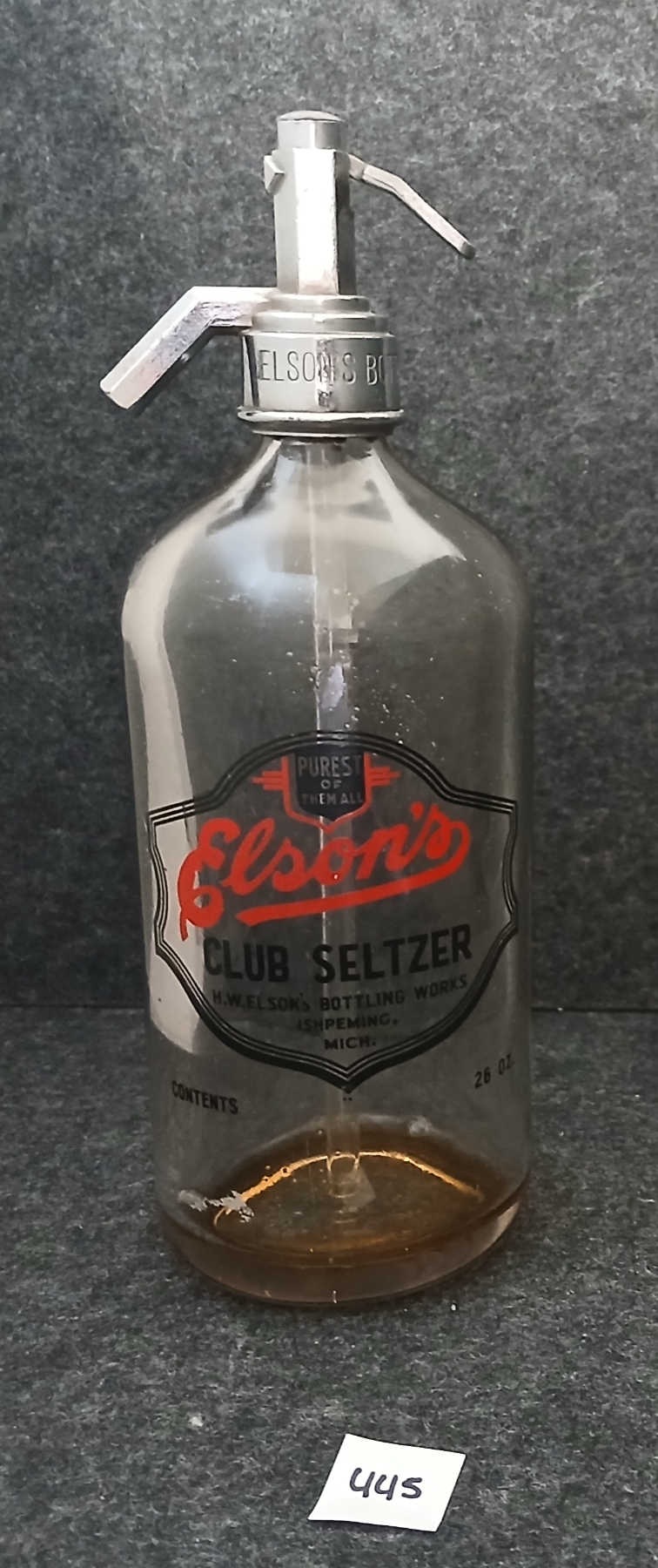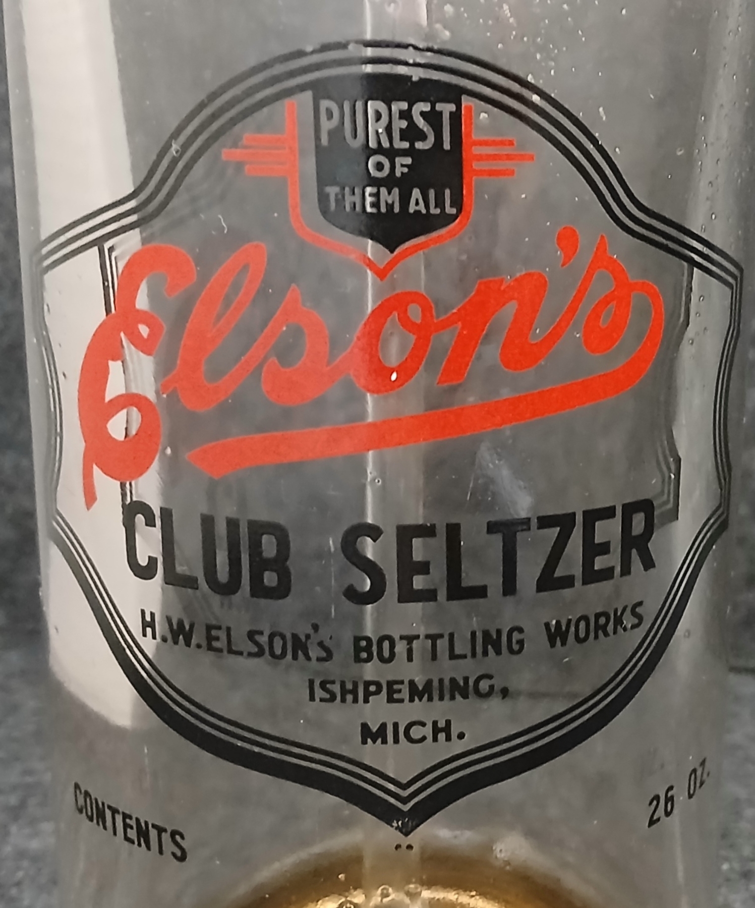NOTE: MARKED H.W.ELSON'S BOTTLING WKS. - ISHPEMING, MICH. - SPIGOT MATCHES - W/ SMALL QTY OF CONTENTS