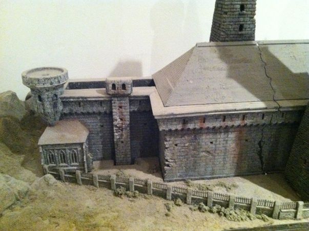 I should mention that the largest tower in the front is purposely loose. It sets in place on pegs. I believe it went over in the shot like a smoke stack. I glued the center steeple as it was broken, and there is a small block missing on the top of the right side. [I am currently having another fabricated so this will be complete again]. Other than that there are a few bumps and chips here and there from use and storage.