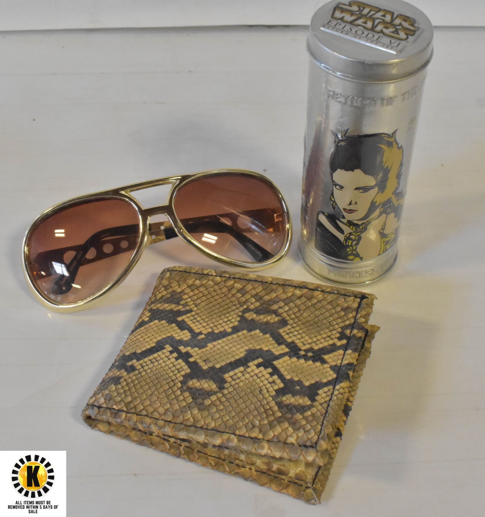 ELVIS GLASSES, SNAKESKIN WALLET & STARWARS WATCH