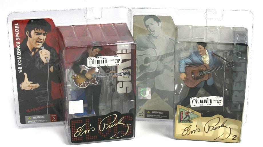 Grouping includes two Elvis Presley commemorative action figures. These include the '68 Comeback Special 2004 and 50th Anniversary Rockabilly 2004. Condition is mint in box.