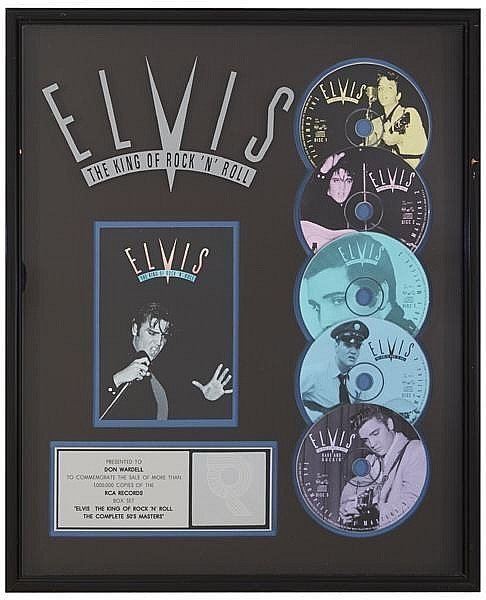 An RIAA "platinum" compact disc award, ELVIS THE KING OF ROCK 'N' ROLL THE COMPLETE 50'S MASTERS, R.I.A.A. presented to Don Wardell.