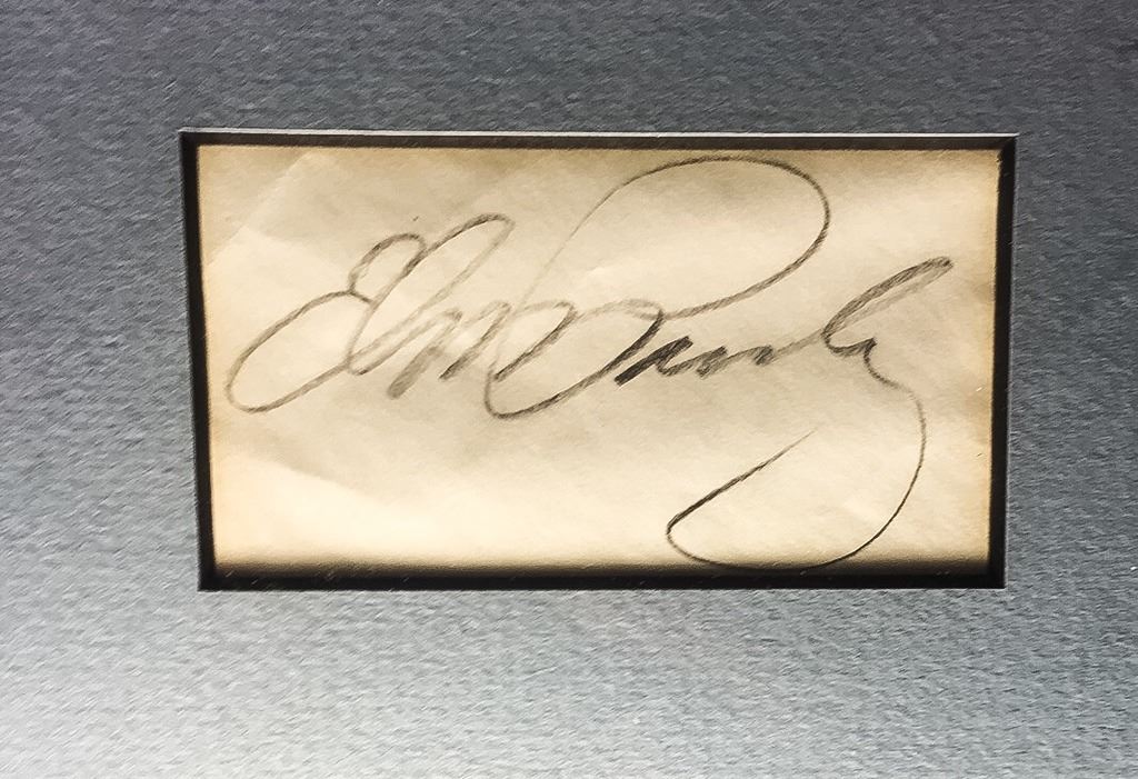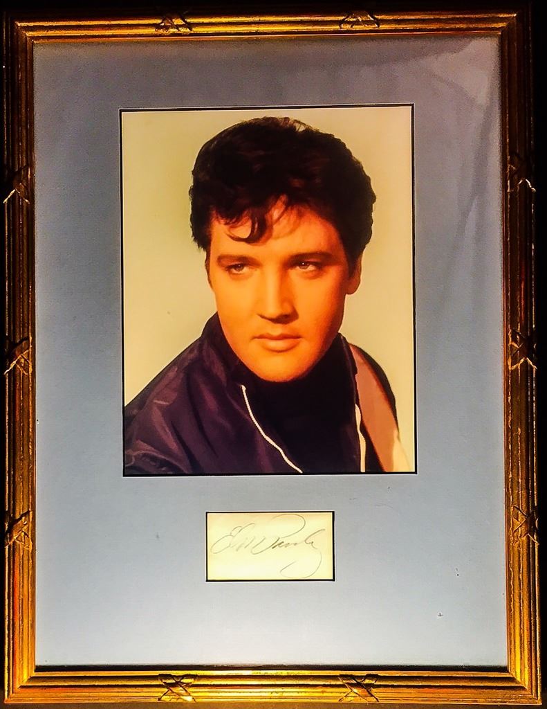 AN ELVIS PRESLEY SIGNED PAGE MOUNTED AND FRAMED IN A DISPLAY. MEASURING 14 x 18 INCHES.