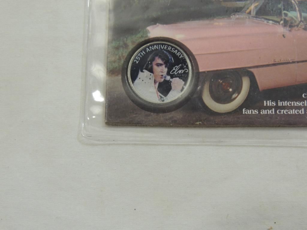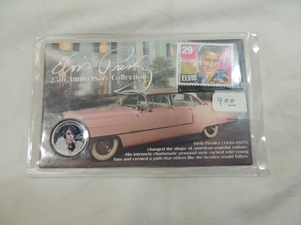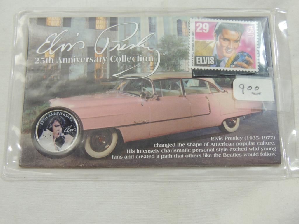 ELVIS PRESLEY 25TH ANNIVERSARY COLLECTION STAMP AND COIN, COLLECTIBLE, COLLECTOR SHEET, AS SHOWN SEE PHOTO FOR MORE DETAILS.