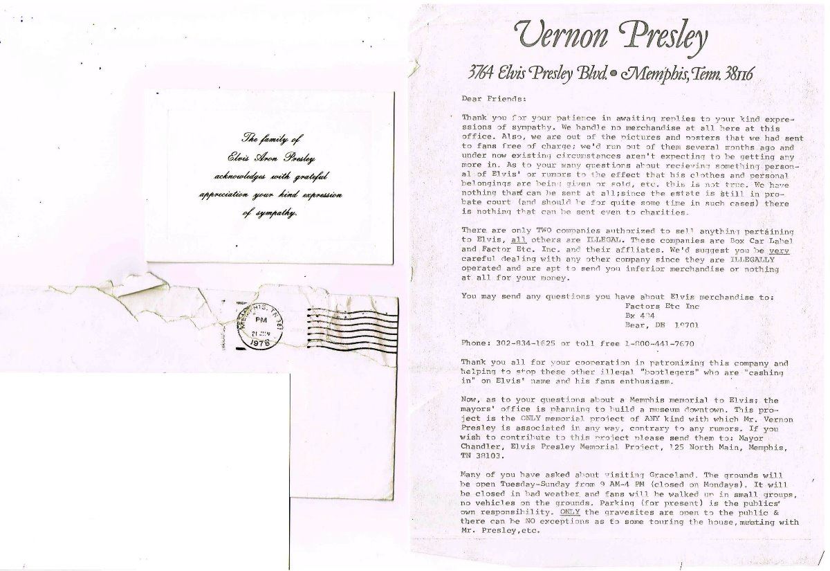 An original "Elvis Aron Presley" sympathy card that was sent on behalf of his family upon his death to a fan who had written them with their sympathy. The white card is embossed with black lettering and is accompanied by the original envelope it was mailed in. Post dated from 1978.