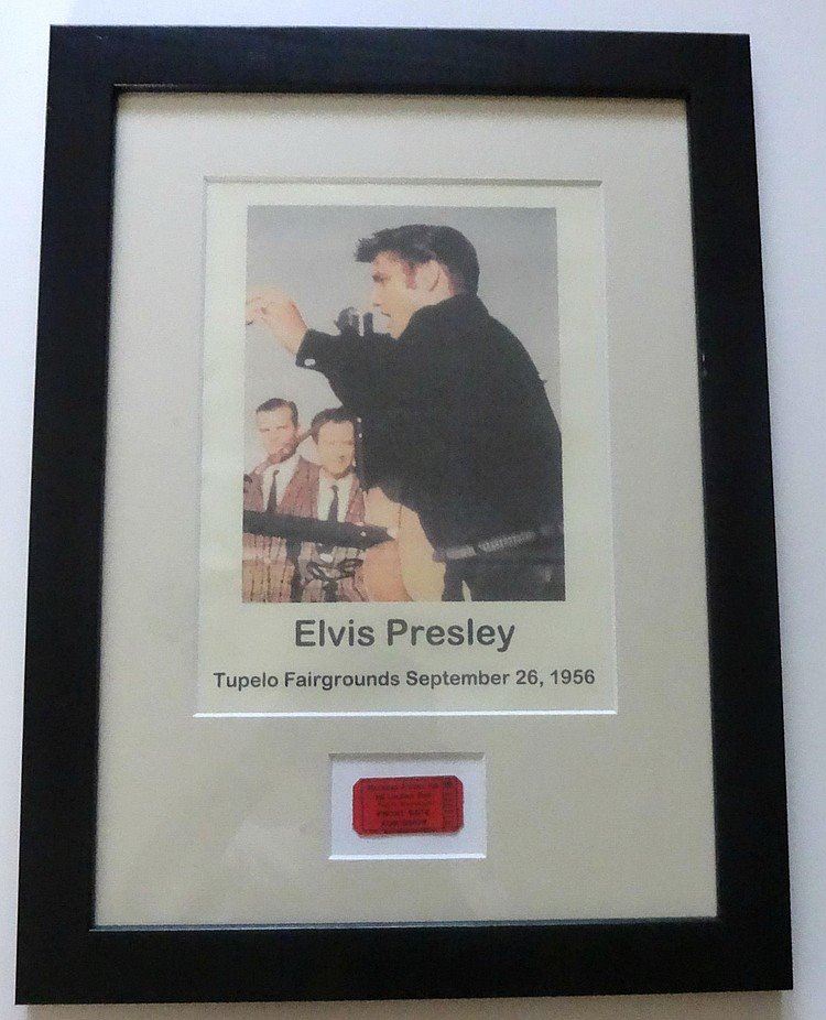 An Elvis Presley Front gate admission concert ticket for the September 26, 1956 concert, number 90-080976, from the Mississippi-Alabama Fair and Dairy Show held in the town of Elvis' birth, Tupelo, Mississippi. Elvis performed with The Jordanaires for two shows. Housed with a large laminated photograph from this performance. His parents attended this concert and so did a young 14 year old Wynette Pugh (Tammy Wynette) who was in the front row.