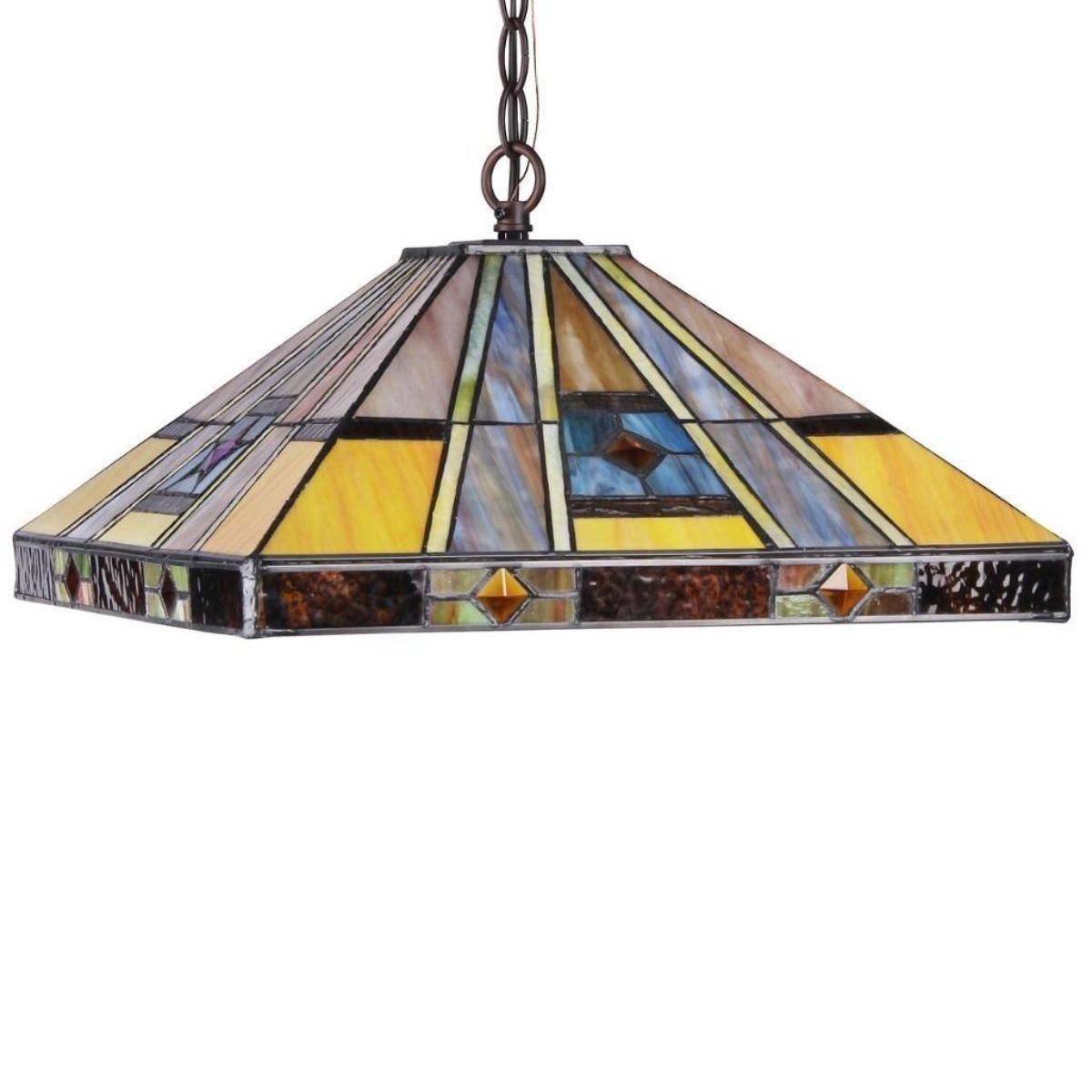 Ely, a magnificent Mission style pendant. The amber hues will add a vintage touch to any room it is installed in. This pendant brings nostalgia charm your bedroom, living room, foyer, or guest room. Â (Max hanging distance: 68.7 inch) Glass TypeTiffany-glass Net Weight (lbs)6.97 Overall Length15.94 Overall Width15.94 Overall Height7.28 Overall Diagonal22.32 Max Hanging Distance68.7 Shade Width15.94 Shade Height7.28 Shade Diagonal22.32 Ceiling Chain, Stem, Wire Length60 Electric Wire Length86 Canopy Width4.9 Canopy Height1.1 Canopy MaterialsMetal Wattage/Bulb Types(2) 60 Watt max E26 Type A Bulb (not included) Switch TypeHardwired Est. Glass Cuts160pcs glass cut Light DirectionDownlight Specific UsesIndoor FinishDark Bronze Overall MaterialsGlass, metal; electrical components Glass Thickness0.12 Shade ShapeSquare