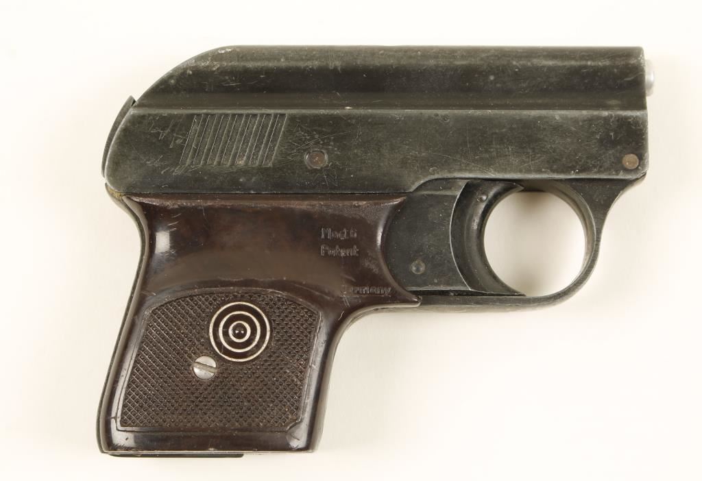 Blued semi-automatic blank-firing starting pistol with one magazine. Bluing is worn and faded with scratches. Plastic grips have a repaired break. Action works. Condition is fair.