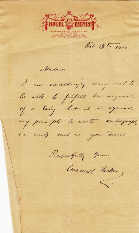 (1868-1941) German chess player still regarded as one of the best of all time. Uncommon A.L.S. 1p. 8vo., New York, Oct. 5, 1902, an ironic letter to a lady regretting that he could not send an autograph, yet signed in full! Fold at left margin, tipped to another sheet, very good.