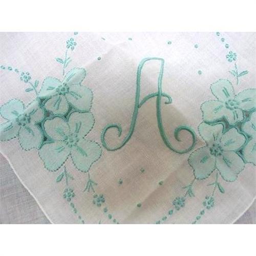 BEAUTIFUL NEVER USED AND IN MINT CONDITION VINTAGE HANKY, ORIGINAL STICKER, MADE IN MADEIRA, IT IS EMBROIDERED WITH LOVELY MINT GREEN THREAD, DEPICTING LARGE MONOGRAM "A" AND ADORNED WITH BEAUTIFUL LARGE BLOSSOMS DONE IN PATCHWORK STYLE, as per images - Measuring 14" square, US Buyer to pay 2.00 for shipping plus 1.30 for insurance.THANKS.