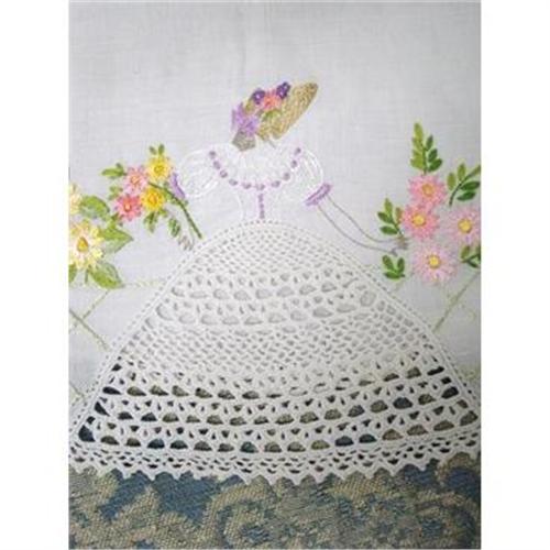 BEAUTIFUL ANTIQUE PILLOWCASE, EMBROIDERED WITH SILKY THREAD, DEPICTING ARRAY OF LOVELY FLOWERS AND A YOUNG LADY WITH GOLDEN HAT AND A LACE DRESS, as per images - Very fine condition - measuring 35" x 20" wide, US Buyer to pay 5.00 for shipping plus insurance.THANKS.