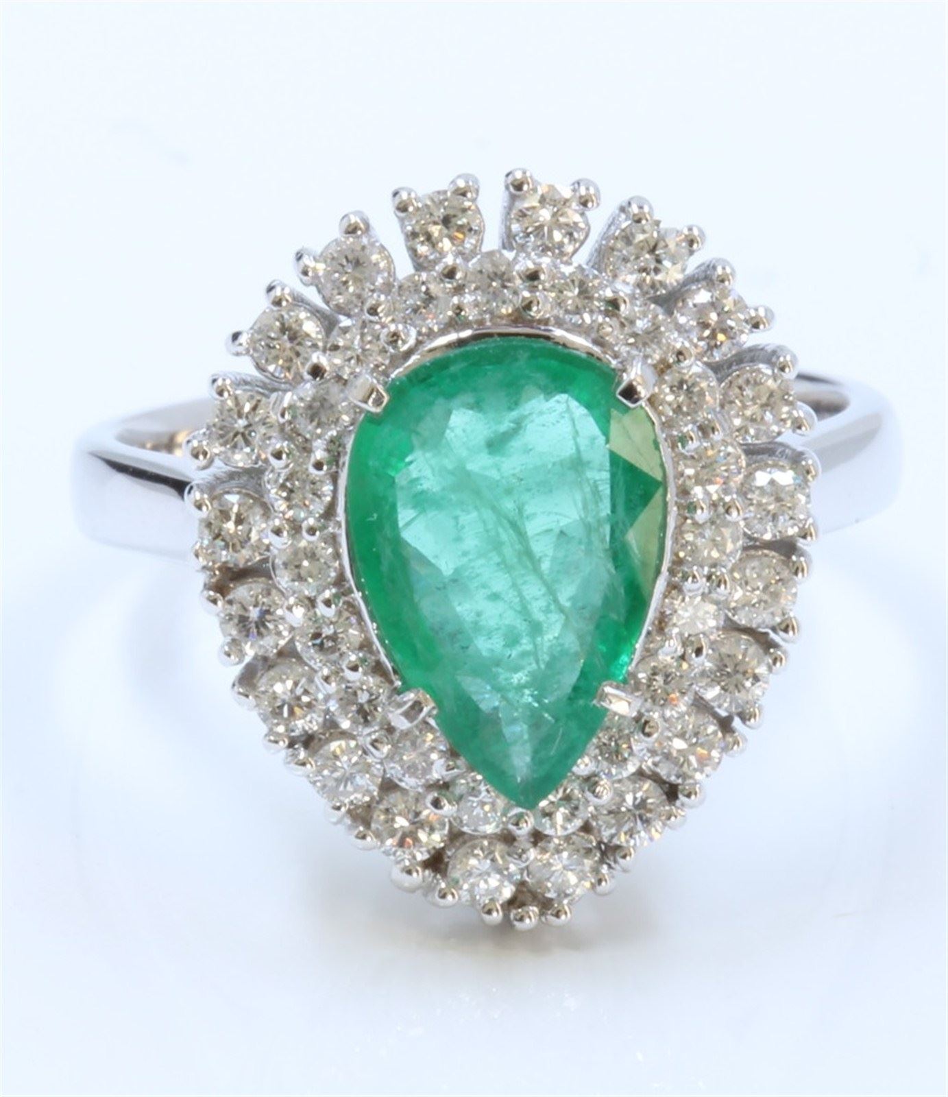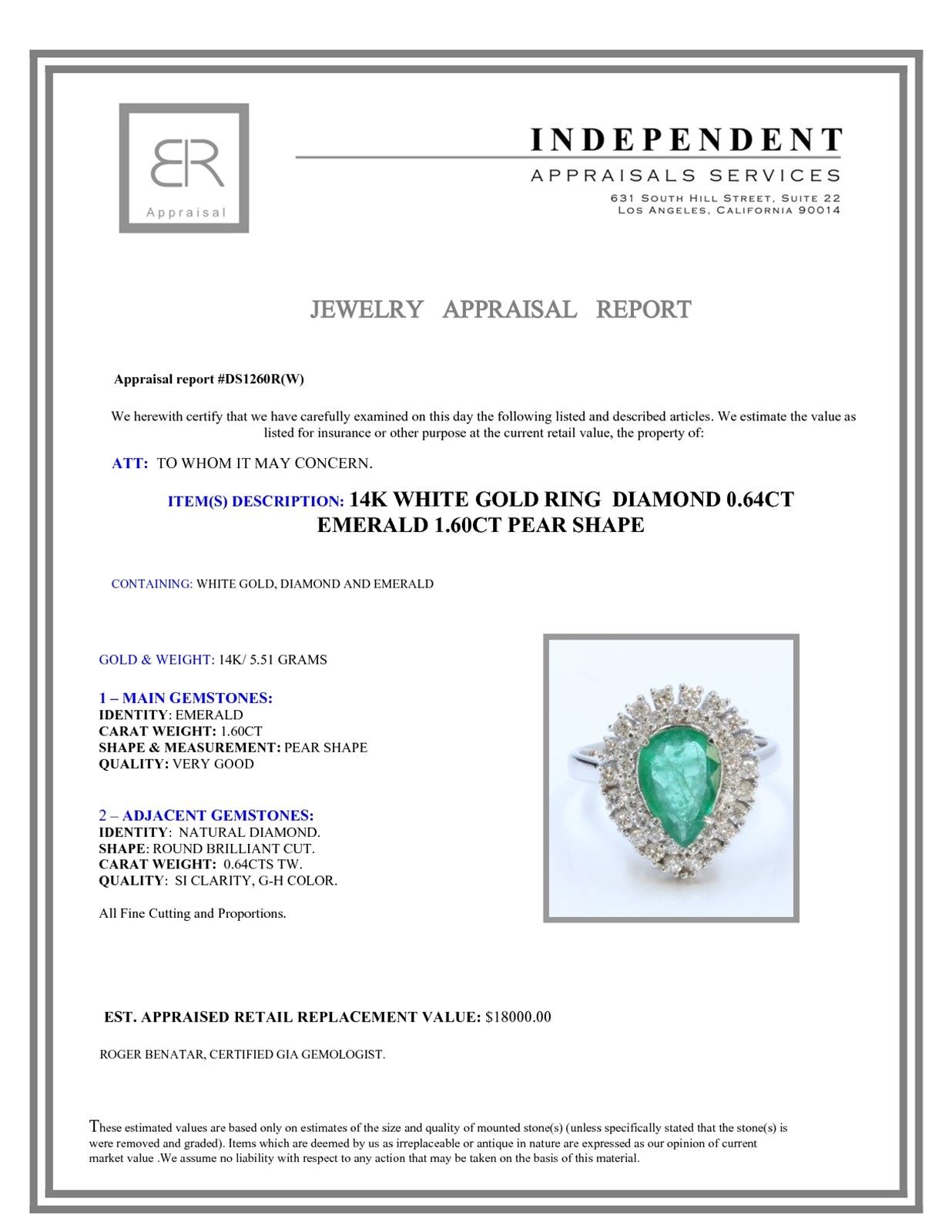 14K WHITE GOLD RING 5.51GRAM DIAMOND 0.64CT EMERALD 1.60CT PEAR SHAPE