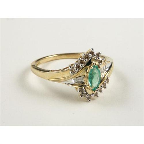 RING: Brilliant 10k yellow gold lady's ring set with a marquise cut emerald and surrounded by baguette cut diamonds and cognac colored round cut diamond. The slightly dark green emerald measures approximately 0.33 cts and is semi-transparent. The diamonds measure approximately 0.25 ctw and have SI2 to I1 clarity. The baguette cut diamonds have I color. Appraisal included.