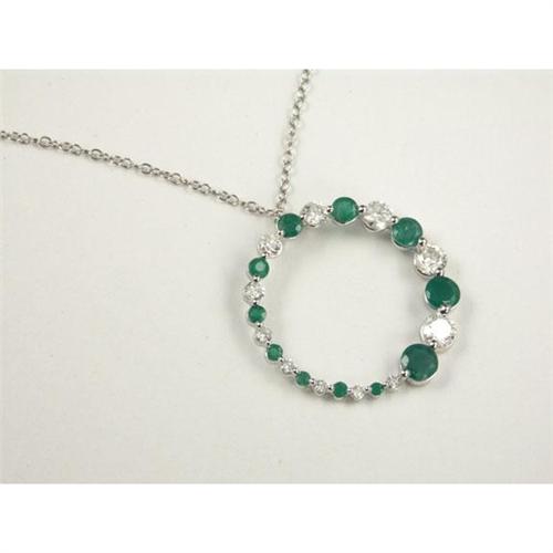 PENDANT WITH CHAIN: Playful 14k white gold circle pendant with chain set with graduated round cut emeralds and diamonds. The medium green emeralds measure approximately 1.00 ctw and are semi- transparent to translucent. The diamonds measure approximately 1.00 ctw, have SI2 to I1 color and F to G color. Appraisal included.