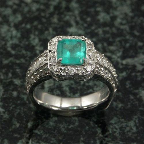 RING: Magnificent 14K white gold lady's ring set with a rich grass green emerald accented by round cut diamonds around the emerald and along the band. The square cut emerald measures approximately 1.21 cts. The diamond measure approximately 0.78 ctw, have I1 clarity overall and G to H color. Appraisal included.